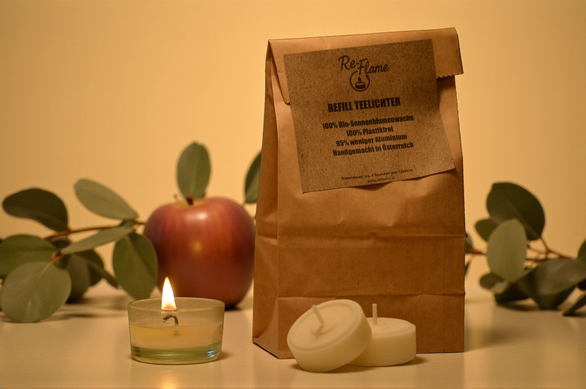 Hier bei Re-Flame gibt es nur nachhaltige Kerzen aus Bio-Sonnenblumenwachs. Egal ob unsere exklusive Reveal Knisterkerze oder die Refill Teelichter - jede Kerze ist ein Unikat.