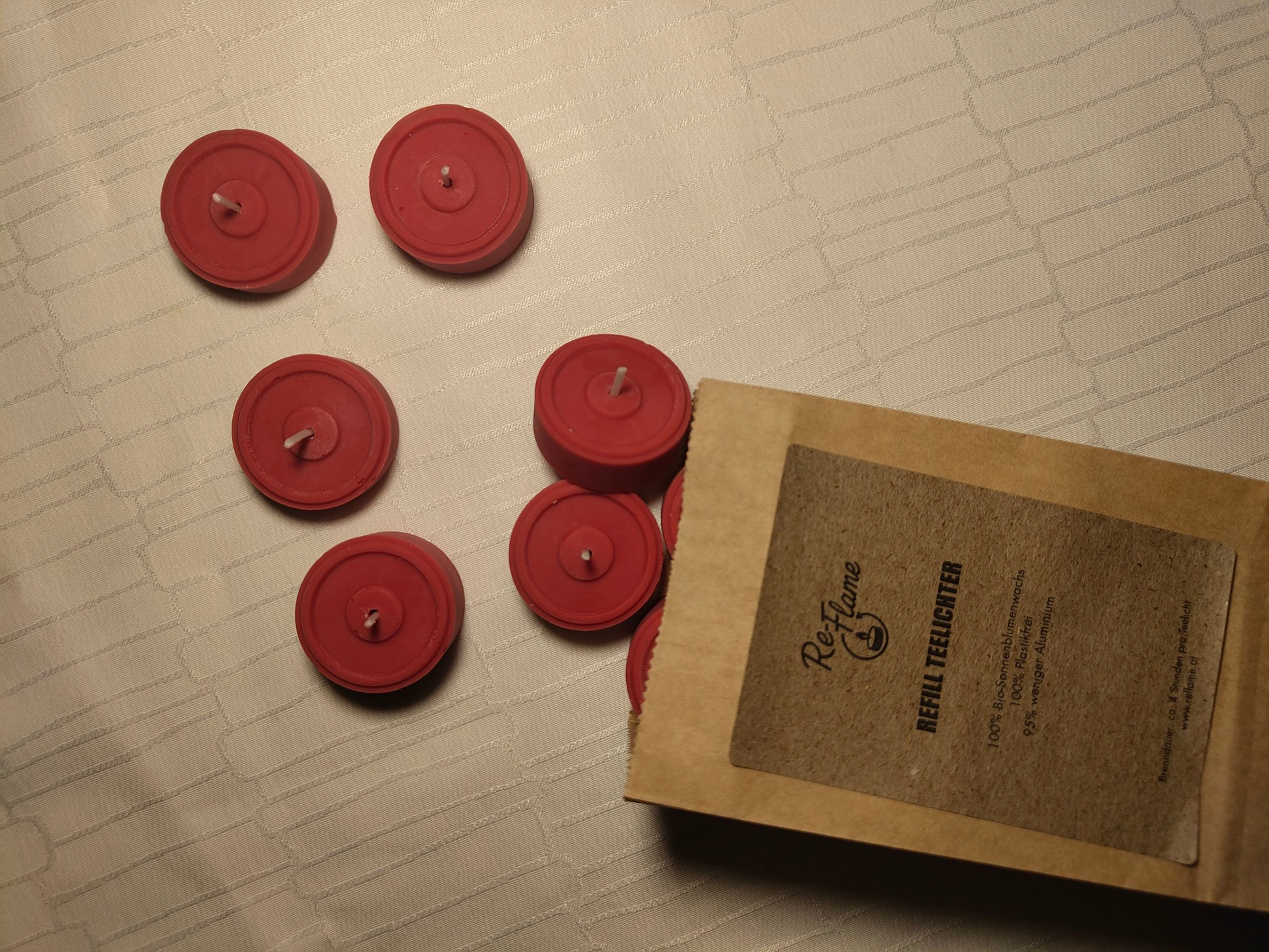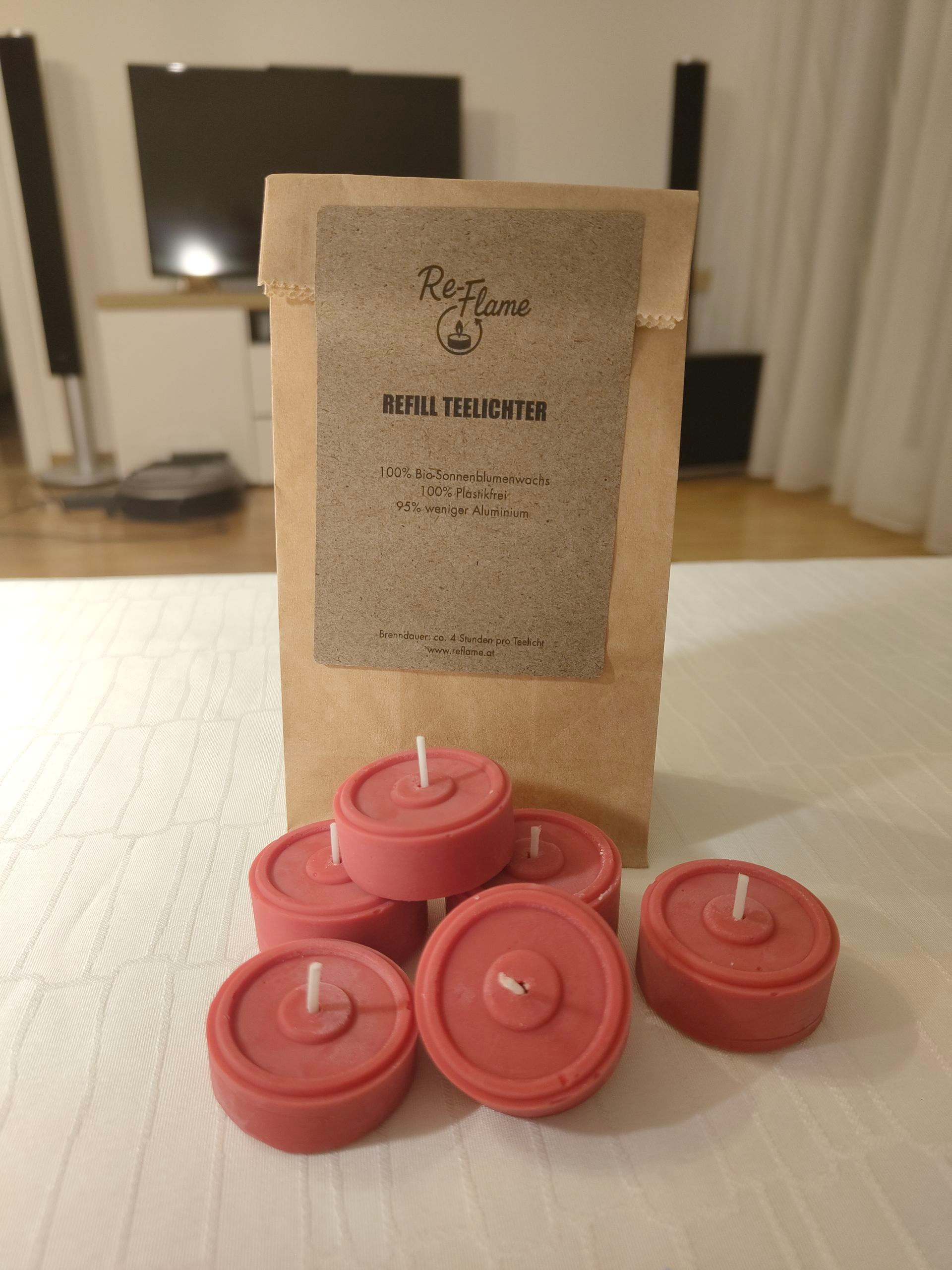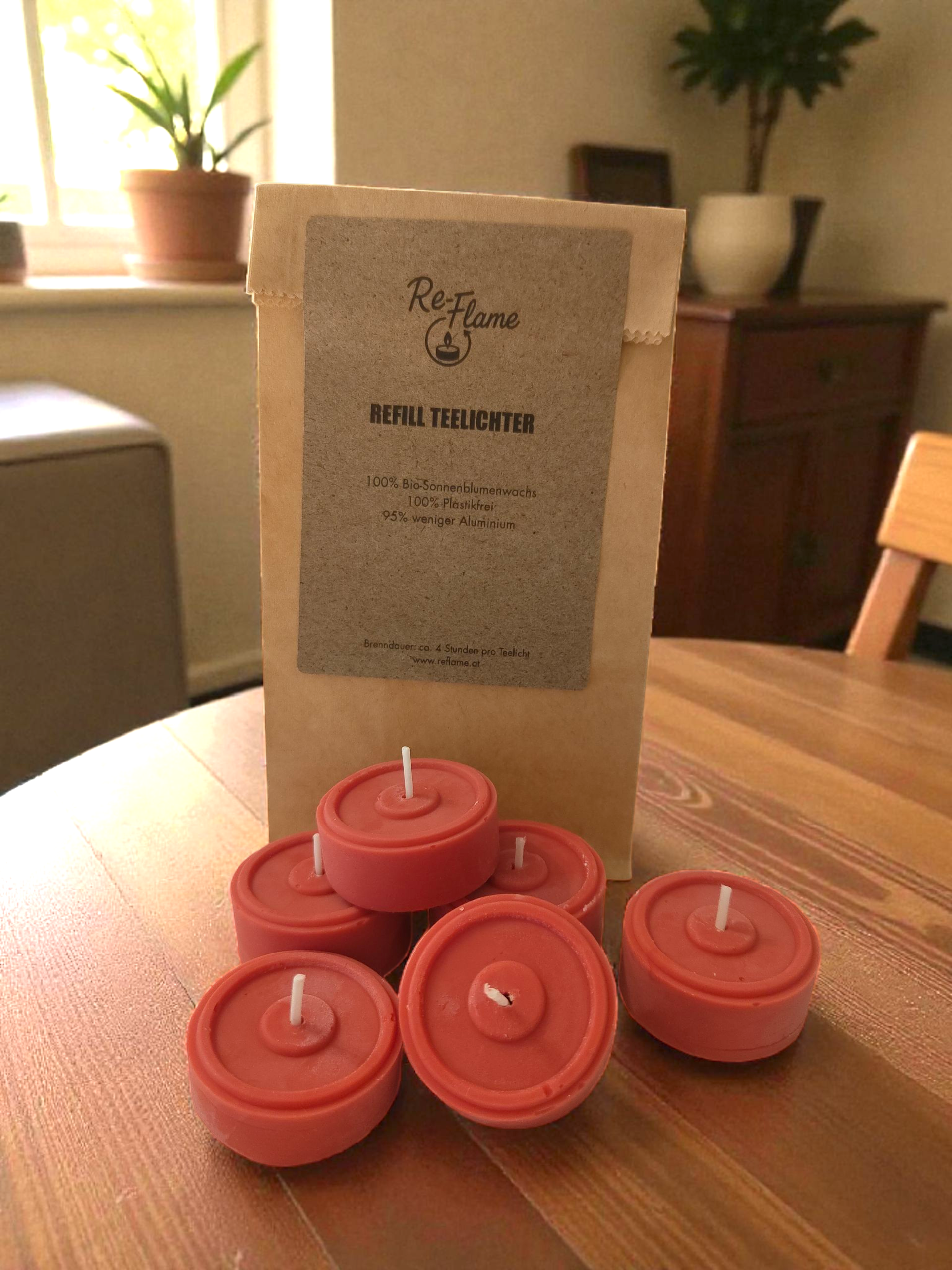 Hier bei Re-Flame gibt es nur nachhaltige Kerzen aus Bio-Sonnenblumenwachs. Unsere Teelichter werden handgegossen, daher ist jedes von ihnen ein Unikat.