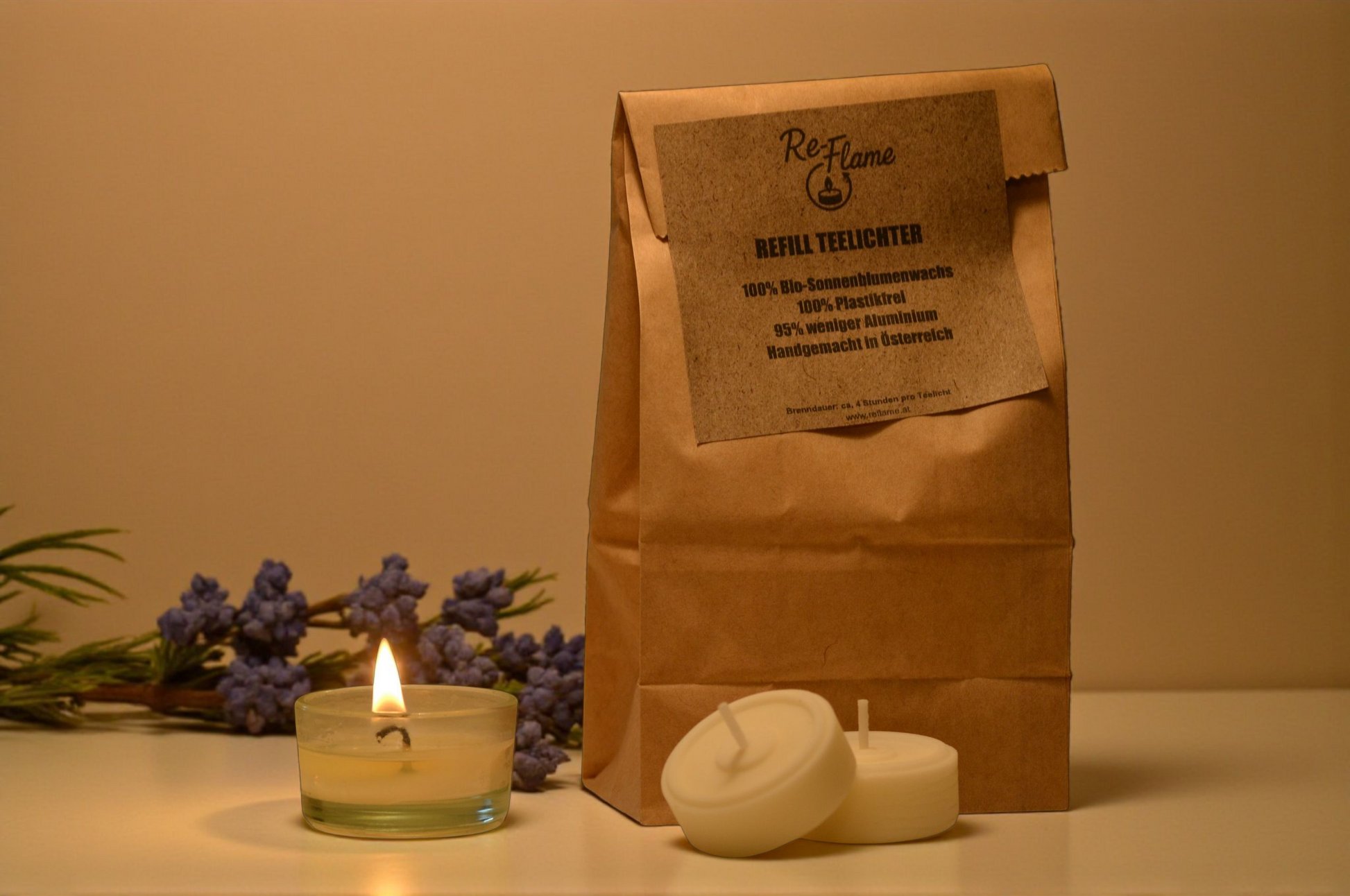 Hier bei Re-Flame gibt es nur nachhaltige Kerzen aus Bio-Sonnenblumenwachs. Egal ob unsere exklusive Reveal Knisterkerze oder die Refill Teelichter - jede Kerze ist ein Unikat.