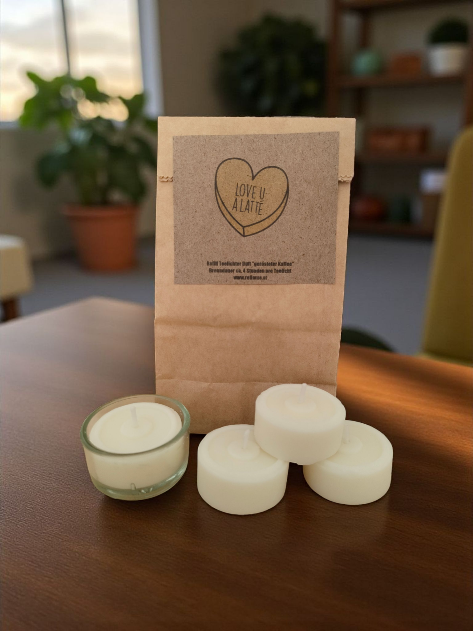 Das Love U A Latte Geschenkset bringt dir 6 Refill-Teelichter im Duft „Gerösteter Kaffee“ und 1 Glashülle verpackt im hochwertigen Jutebeutel.