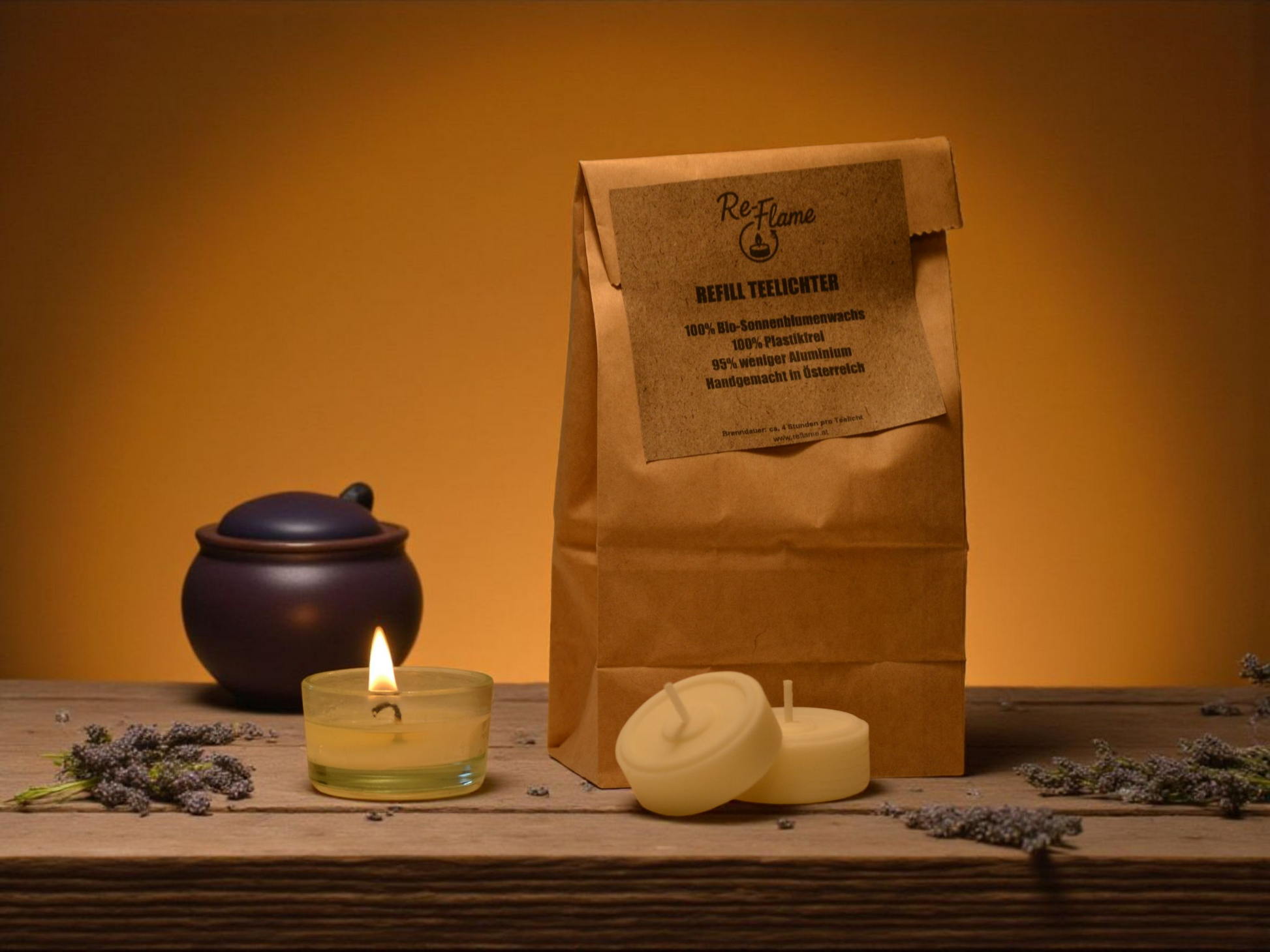 Hier bei Re-Flame gibt es nur nachhaltige Kerzen aus Bio-Sonnenblumenwachs. Egal ob unsere exklusive Reveal Knisterkerze oder die Refill Teelichter - jede Kerze ist ein Unikat.