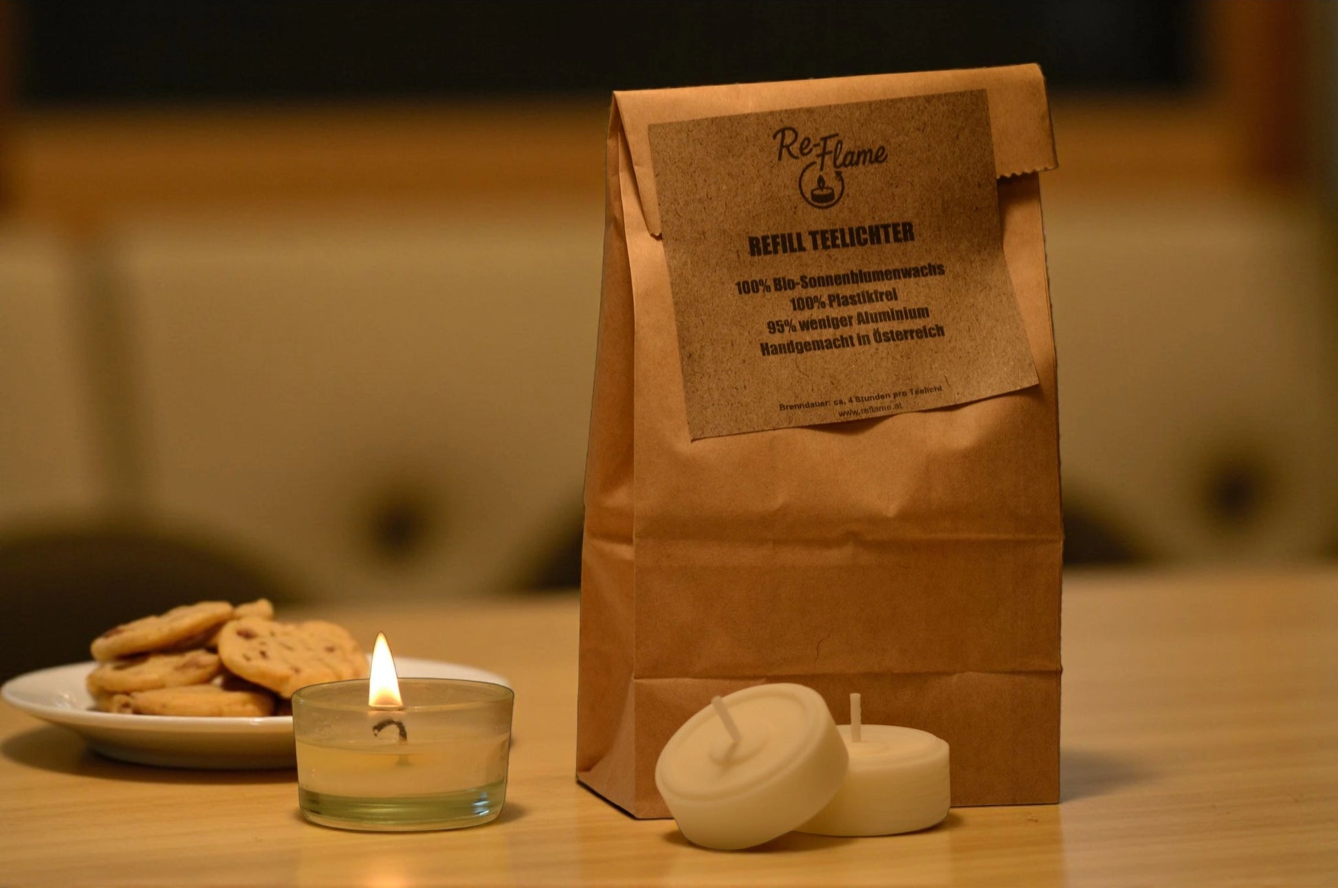 Hier bei Re-Flame gibt es nur nachhaltige Kerzen aus Bio-Sonnenblumenwachs. Egal ob unsere exklusive Reveal Knisterkerze oder die Refill Teelichter - jede Kerze ist ein Unikat.